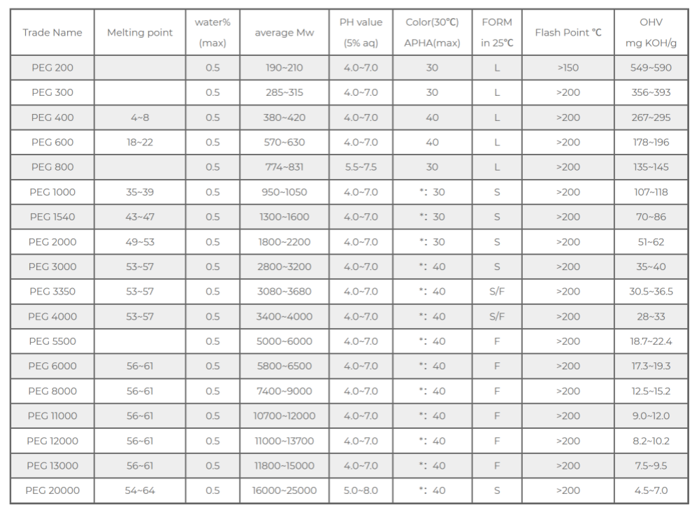 PEG-200 a PEG-600: Bajo peso molecular, líquido. Tienen baja viscosidad y excelente solubilidad en agua, y se usan comúnmente como excelentes solventes, plastificantes y humectantes, y se aplican ampliamente en preparaciones líquidas cosméticas y farmacéuticas.