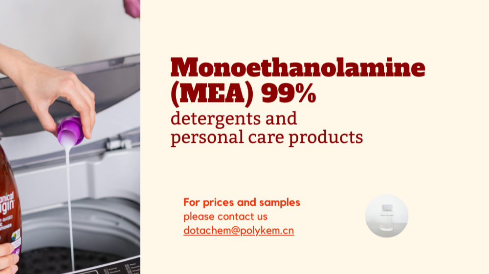 EnAfectar, la monoetanolamina de alta calidad 99% que ofrecemos cumple con los requisitos estrictos de las industrias de detergentes y cuidado personal. Para obtener más información sobre nuestros productos MEA y sus especificaciones, haga clic enaquípara visitar la página del producto. Si tiene alguna pregunta, necesita muestras o desea discutir sus requisitos específicos, contáctenos en dotachem@polykem.cn. Nuestro equipo de expertos siempre está listo para ayudarlo y proporcionar las mejores soluciones para sus necesidades comerciales.
